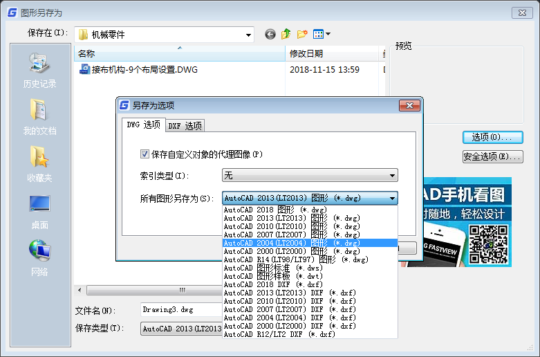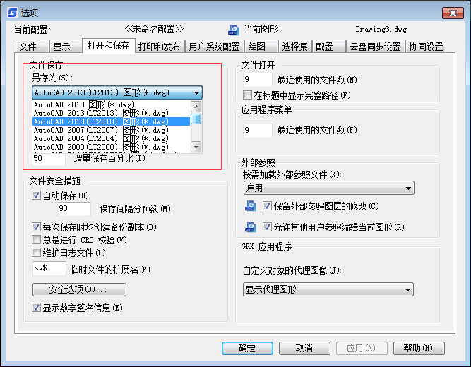 Dwg和dxf选项都可以设置。根据您对版本需求默认常用格式点确定按钮就可以了。
